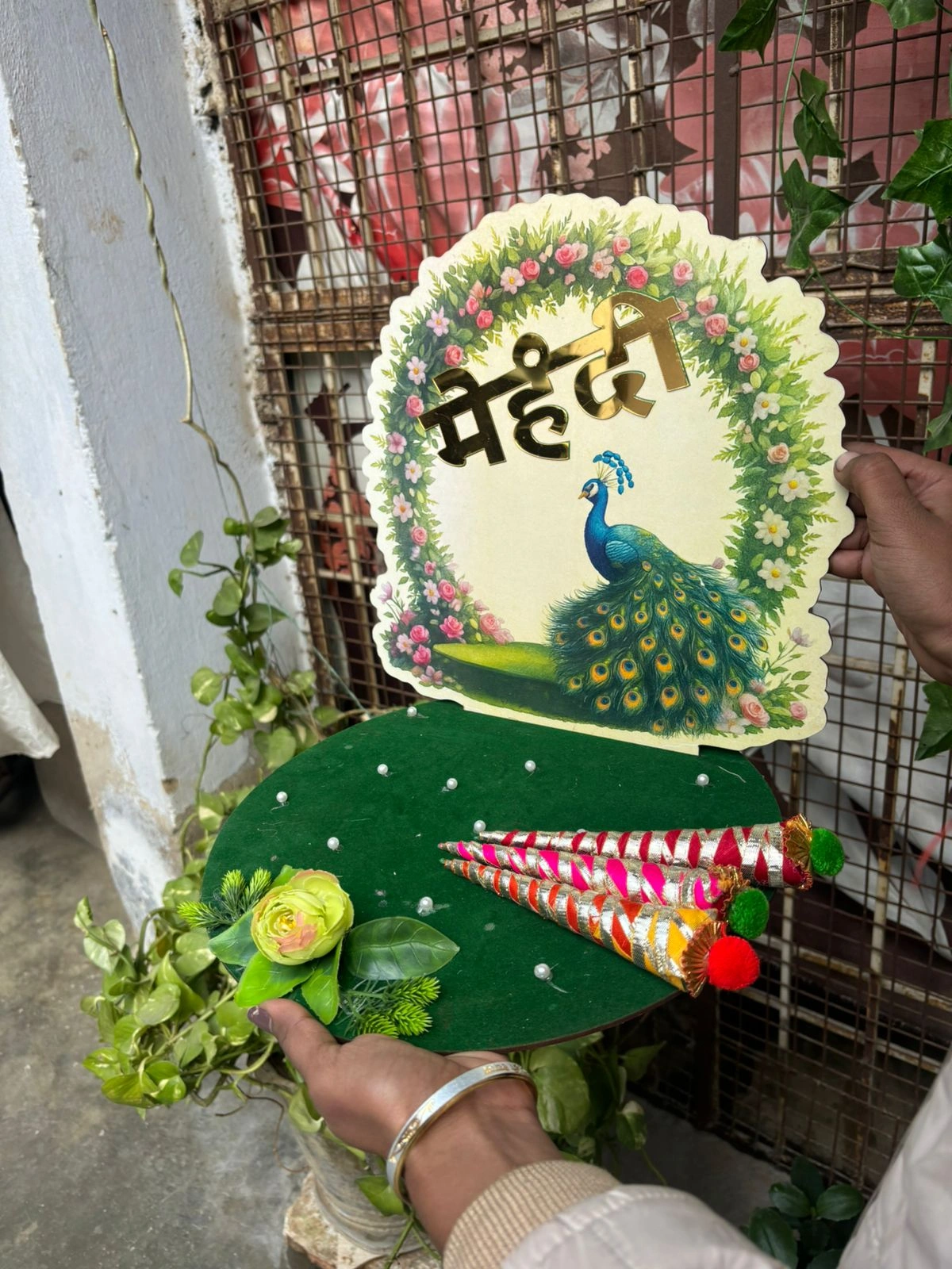 The peacock design symbolizes beauty, grace, and prosperity, making it a perfect choice for weddings, haldi, mehndi, and other pre-wedding rituals. Ideal for holding mehndi cones, flowers, bangles, sweets, or ceremonial items, this decorative platter also works wonderfully as a stage prop or photo-shoot accessory.