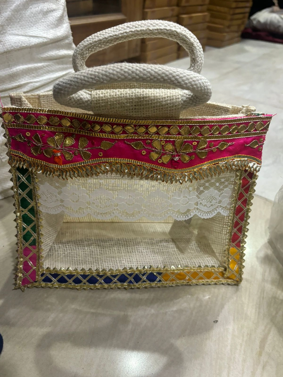 This decorated gota jute bag is a perfect blend of tradition and sustainability. Made from high-quality natural jute and beautifully finished with elegant gota work, it adds a royal touch to any celebration.