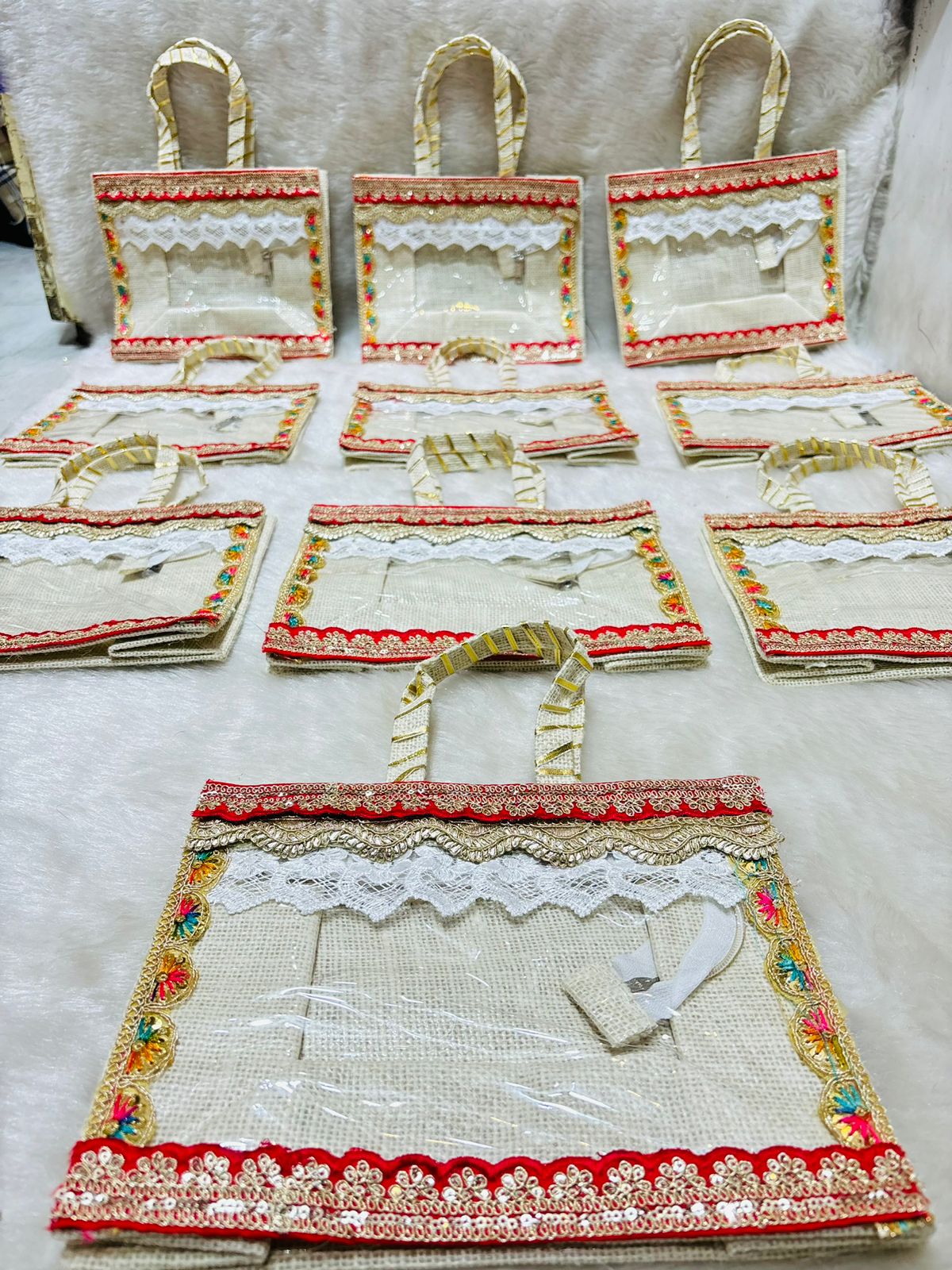 Elevate your gifting experience with our elegant *Decorative Gift Hamper Bag*, designed to add charm and sophistication to any occasion. Made with premium quality fabric and adorned with traditional embellishments like lace, pearls, gota, and tassels, this hamper bag is perfect for presenting wedding favors, festive sweets, return gifts, dry fruits, cosmetics, or customized hampers. Lightweight yet durable, it features a spacious interior with secure drawstring or zip closure to keep your gifts safe and presentable.