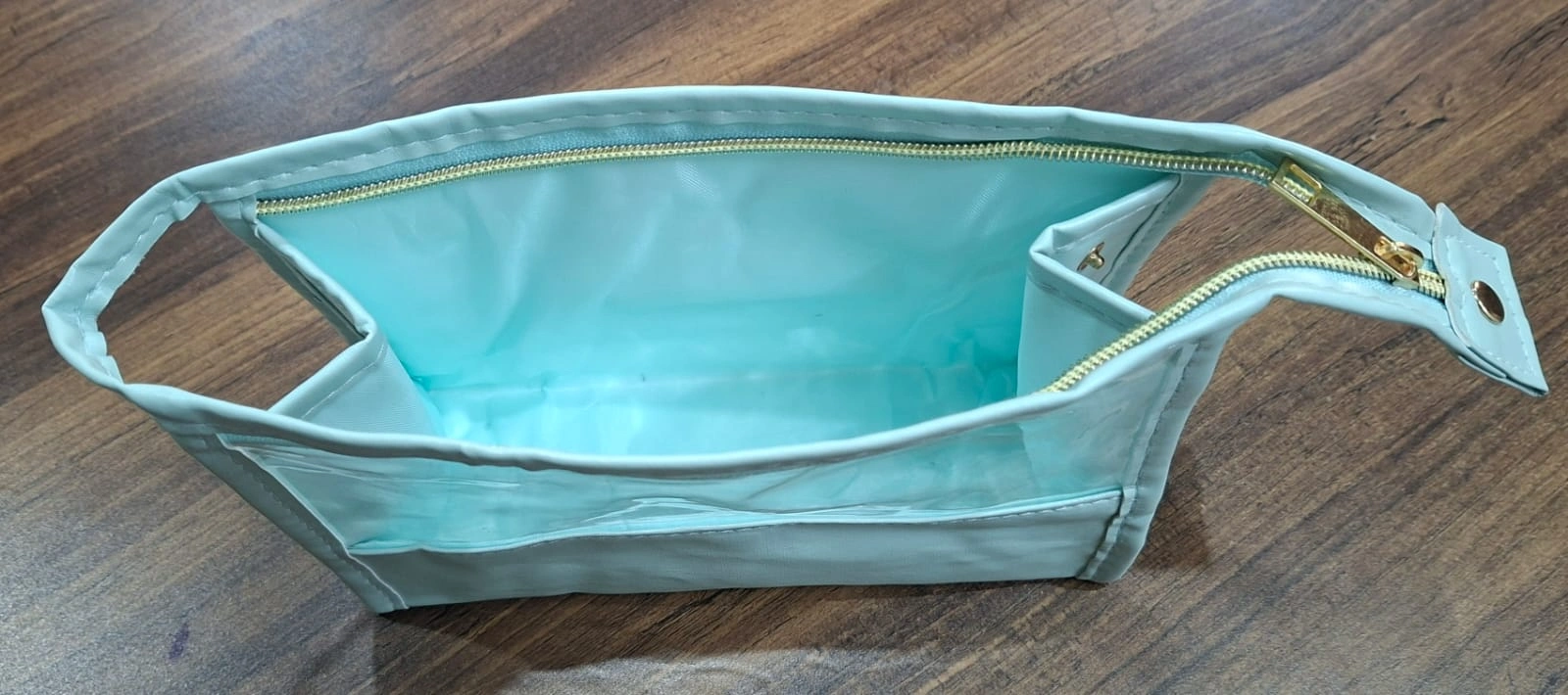 The pouch offers enough space to store makeup items such as lipstick, compact powder, brushes, skincare products, and other essentials. The elegant leather finish gives the bag a luxurious appearance while remaining lightweight and easy to carry.