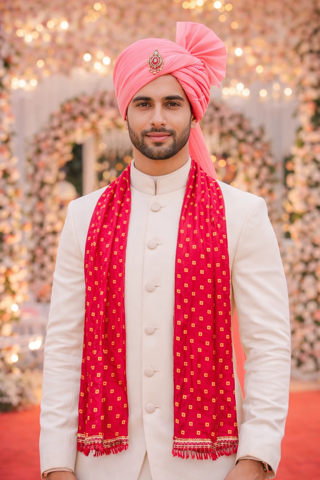 The bright pink color symbolizes joy, celebration, and happiness, making it perfect for barat welcome, groom entry, jaan ceremony, and swagat rituals. It can be worn with sherwani, jodhpuri suit, kurta, or traditional wedding attire.