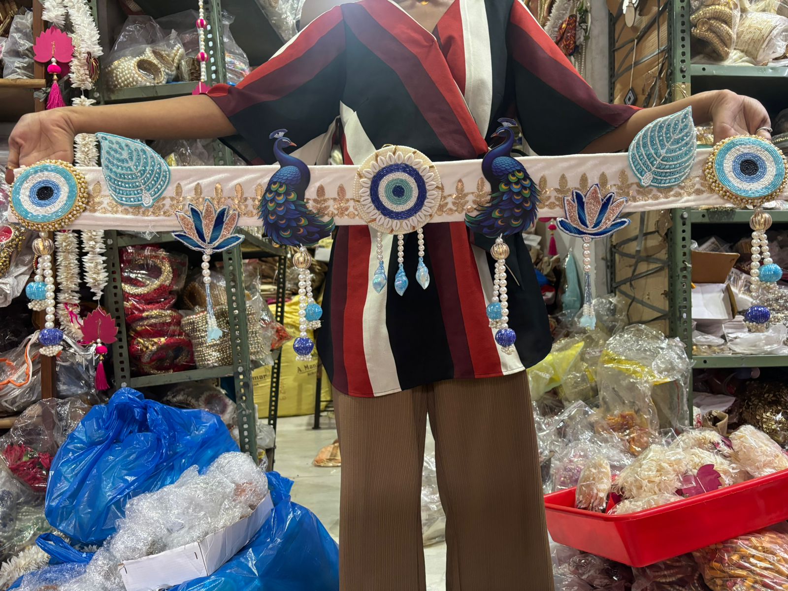The combination of the auspicious evil eye charm and the royal peacock motif symbolizes prosperity, grace, and good fortune. Hang it at your main door, mandir, or living room to invite blessings and festive charm. Lightweight, durable, and reusable, it also makes a thoughtful choice for gifting and return favors during the festive season.