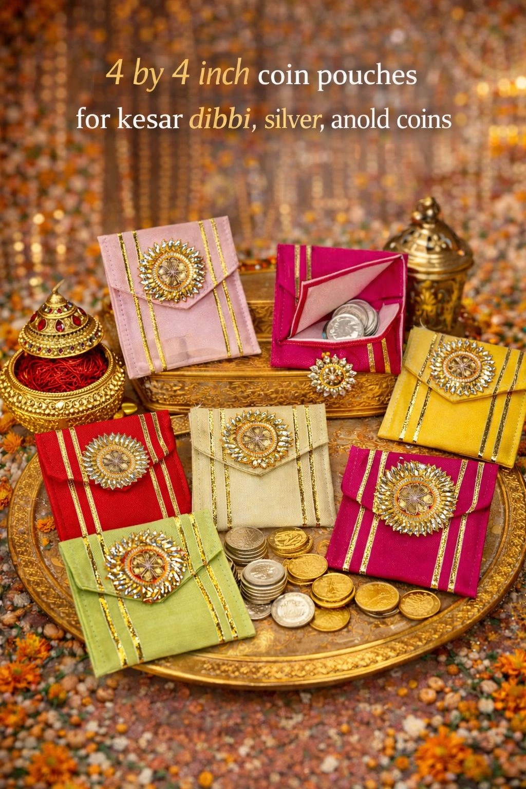 This festive 4×4 inch coin pouch set is thoughtfully designed for weddings, pooja ceremonies, and return gifting. Compact in size yet elegant in appearance, these pouches are ideal for holding coins, shagun, dry fruits, kumkum, haldi, or small sacred items.