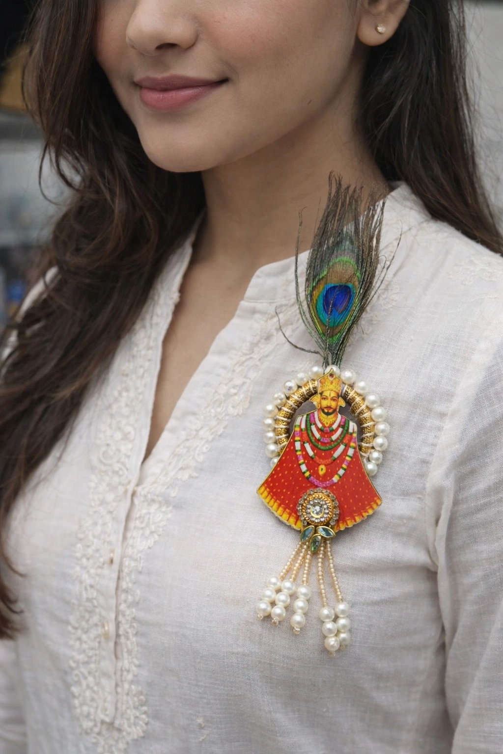 Bring devotion and elegance together with this beautifully crafted Khatu Shyam design brooch. Inspired by the divine presence of Shyam Baba, this brooch is designed to add a spiritual touch to your attire while maintaining a classy and refined look.