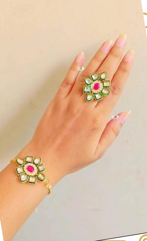 This kundan design bracelet and ring combo set is a perfect blend of traditional charm and festive elegance. Crafted with fine detailing, the set features a beautifully designed bracelet paired with a matching ring that enhances ethnic and bridal outfits effortlessly.