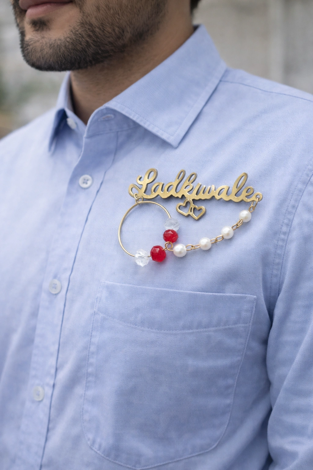 Ladkiwale wedding brooches come in various styles, ranging from simple and elegant pieces to more elaborate designs, depending on the wedding theme and the family’s traditions. Some may also include personalized elements, such as initials or meaningful symbols, adding a sentimental touch. These brooches are generally pinned to the outfits, adding a regal and festive touch to the wedding celebration.
