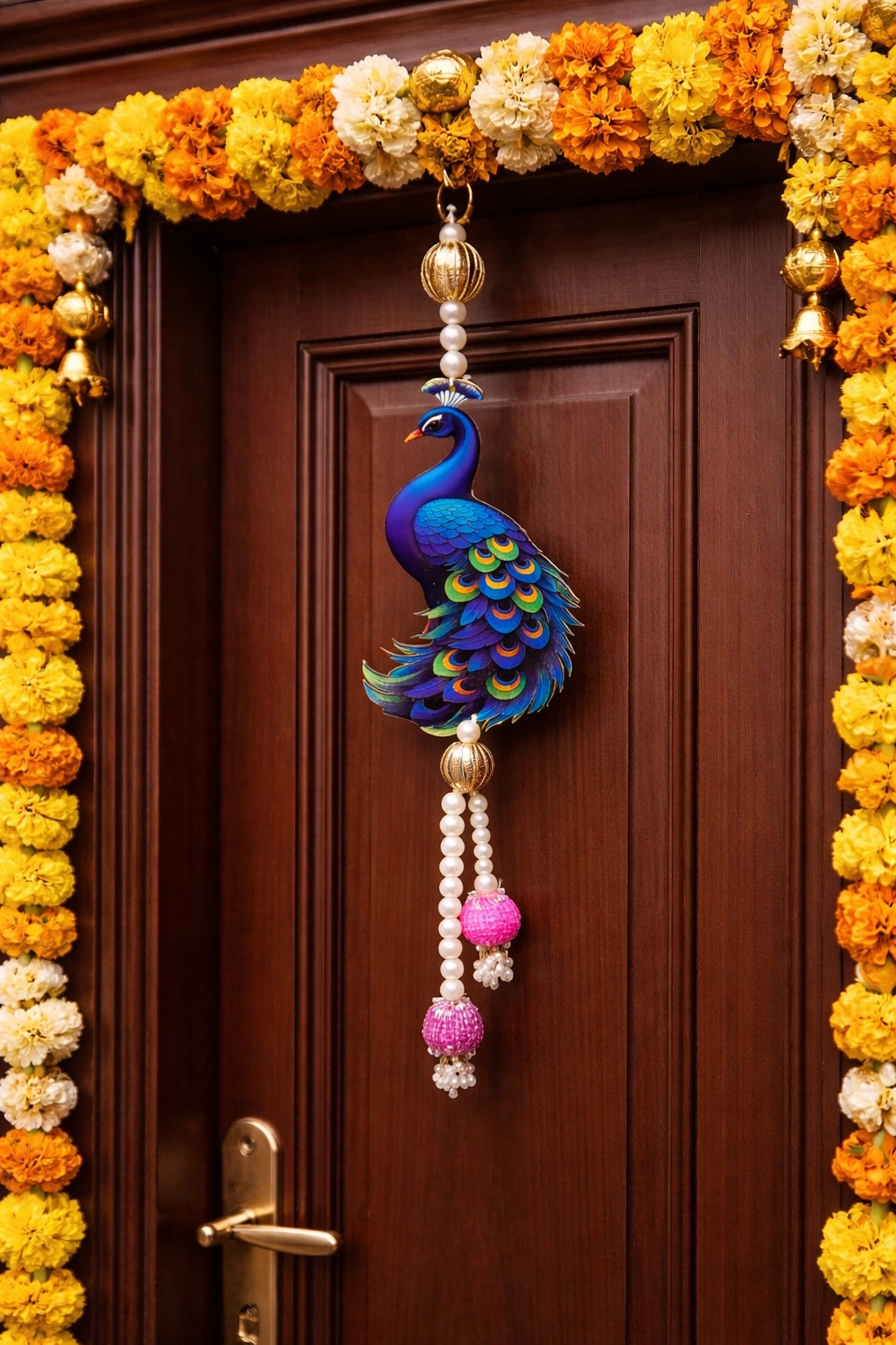 The peacock, known as a symbol of grace and auspiciousness, blends seamlessly with traditional festive themes. This lightweight and durable decoration is ideal for Diwali, weddings, housewarming, pooja ceremonies, and special occasions. Hang it on your main entrance, balcony, pooja room, or living space to create a warm and welcoming atmosphere.