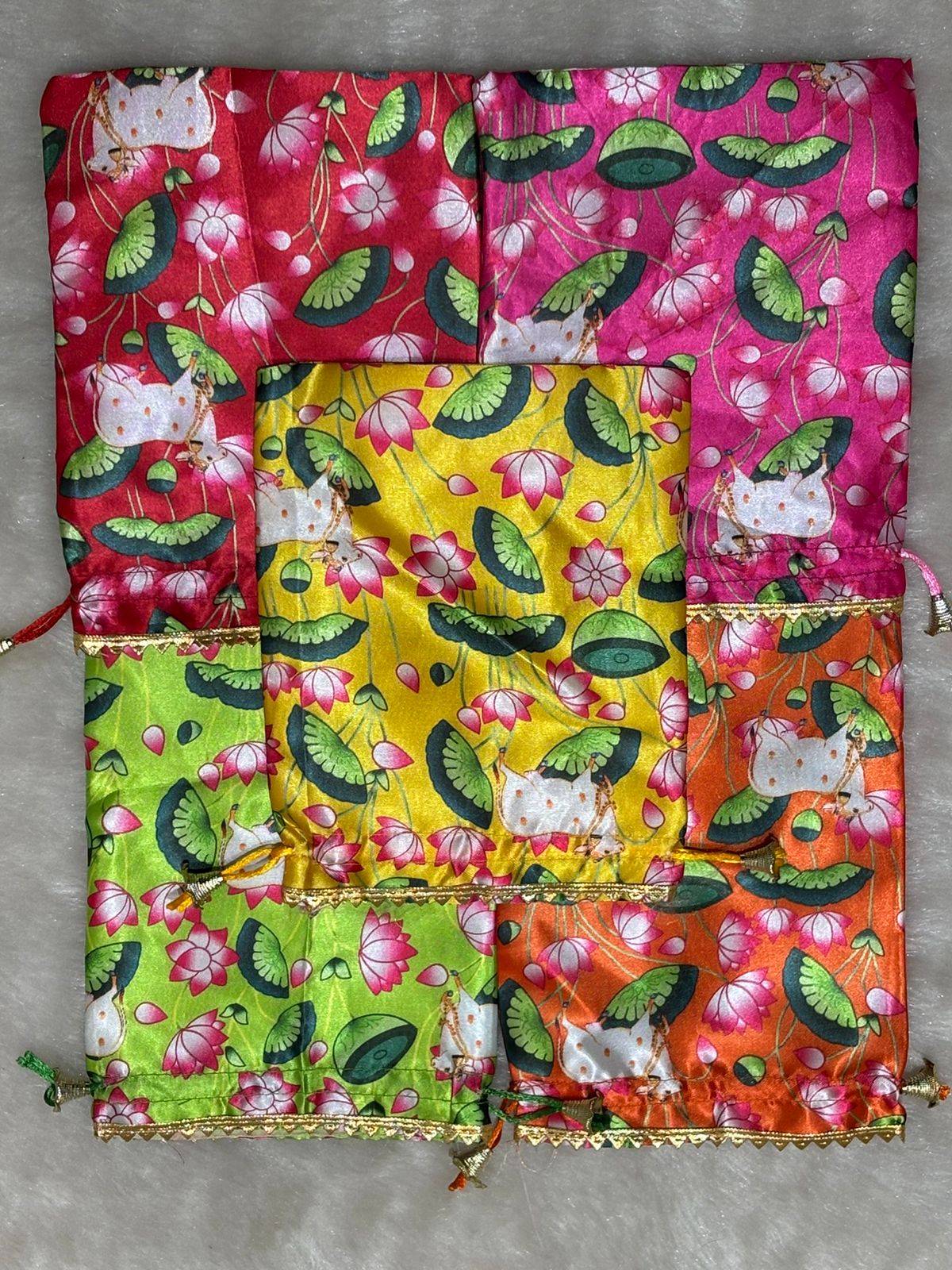 royal touch to your celebrations with this elegant Pichwai Print Potli Bag, inspired by traditional Rajasthani art. Crafted from premium fabric with vibrant Pichwai motifs of lotus, cows, and divine patterns, this potli is perfect for weddings, pooja rituals, festivals, baby showers, and gifting purposes.
