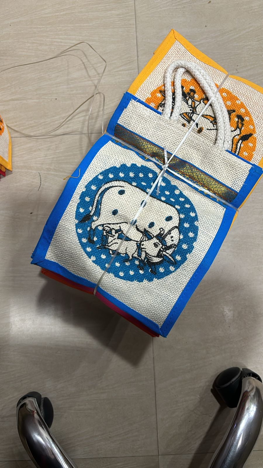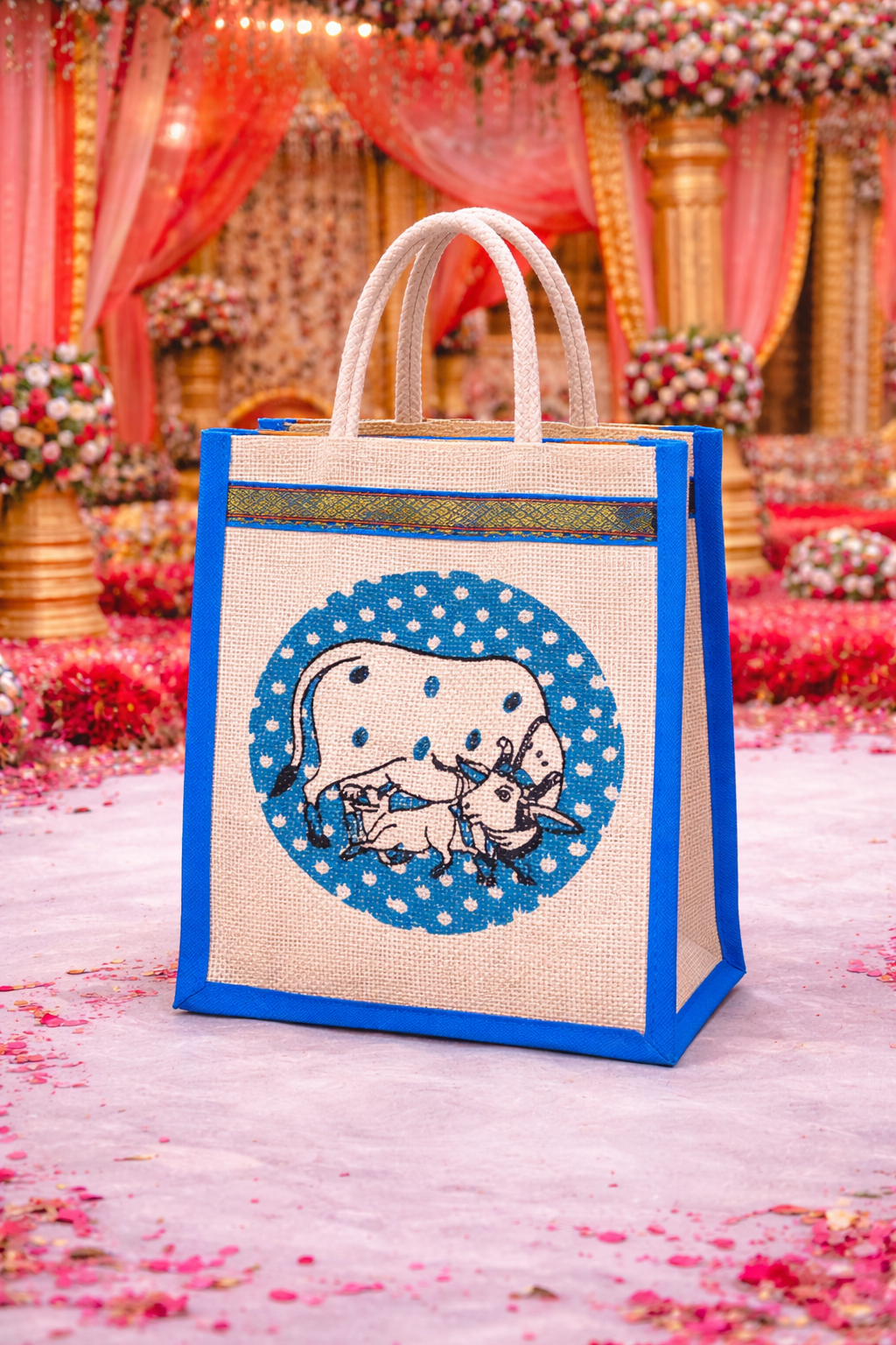 Made from high-quality natural jute, this bag is sturdy, reusable, and eco-friendly. The detailed Pichwai artwork gives it a premium handcrafted look, making it perfect for wedding return gifts, festive gifting, pooja hampers, and corporate giveaways.