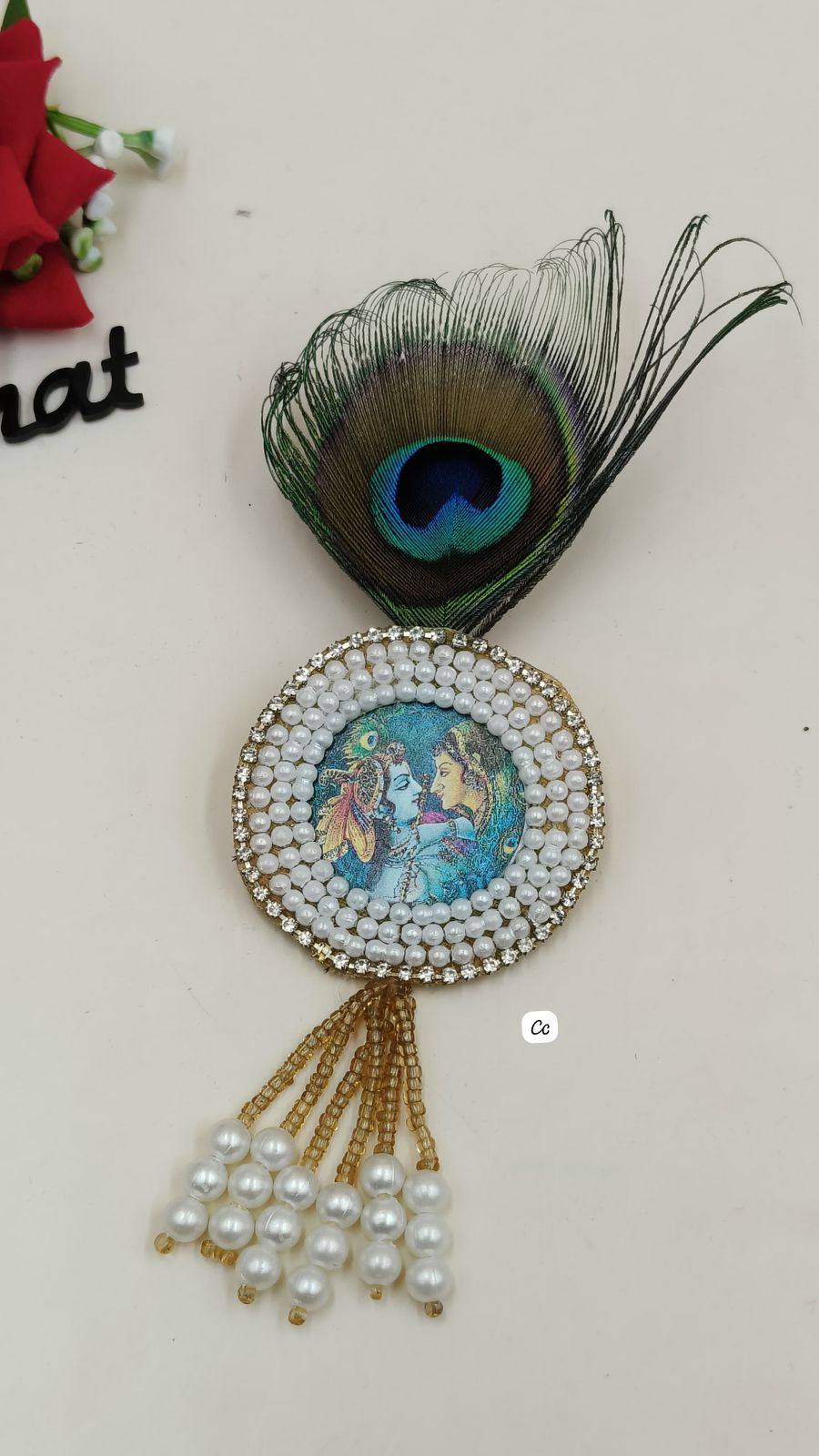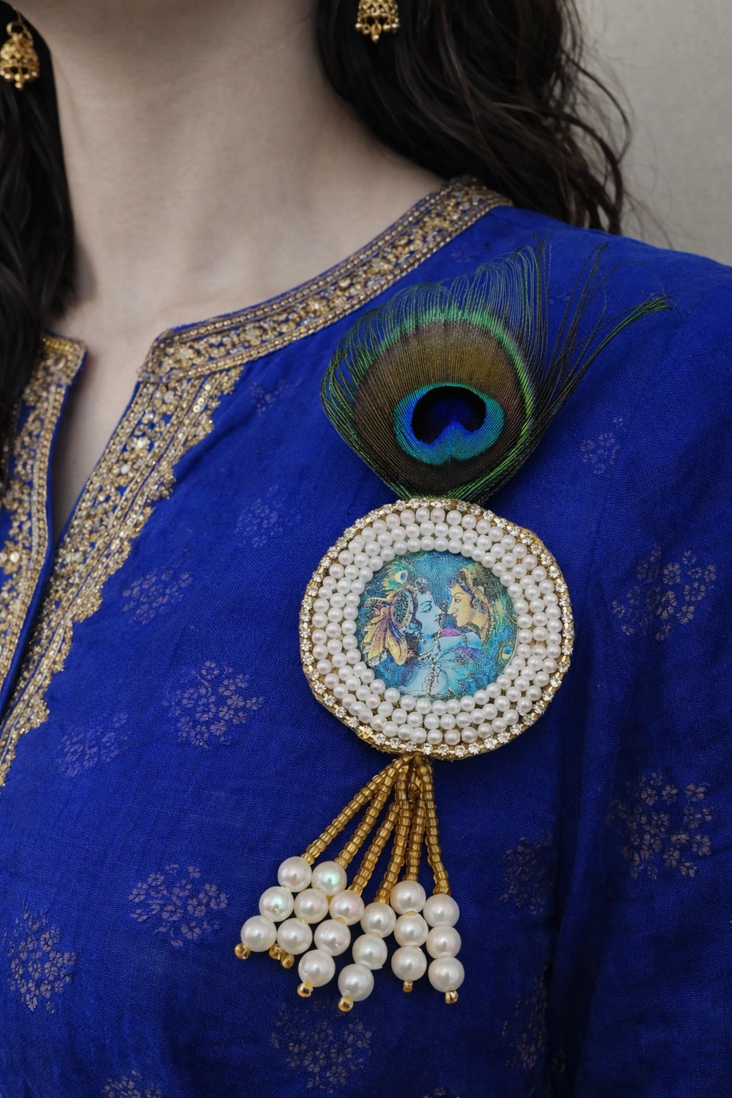 Beautifully crafted with fine detailing, this brooch is perfect for sarees, dupattas, shawls, blouses, lehengas, and ethnic jackets. The Morpank design symbolizes purity and positivity, while the Radha Krishna motif adds spiritual charm, making it suitable for festive occasions, weddings, pooja ceremonies, and cultural events.