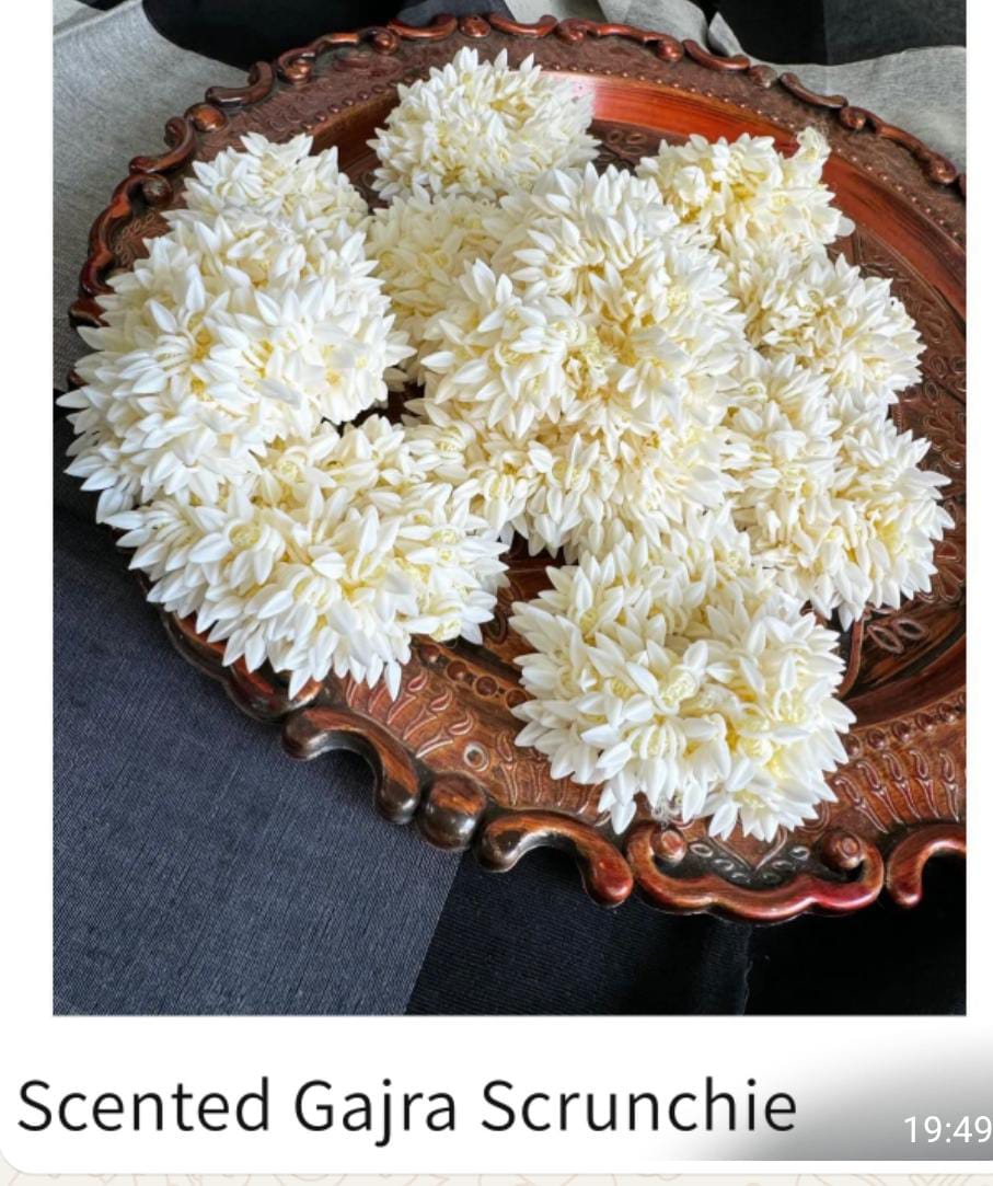 Add a touch of tradition and fragrance to your hairstyle with our Scented Gajra Scrunchies. Designed to look like fresh floral gajras, these scrunchies are lightweight, easy to wear, and infused with a pleasant scent that lasts for hours. Perfect for weddings, festivals, pooja, classical dance, and everyday ethnic wear, they give your hair an elegant and graceful finish without the hassle of real flowers.