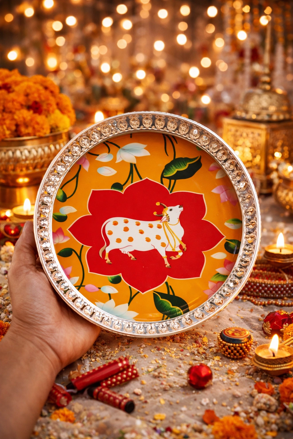 Bring elegance and tradition together with this beautifully crafted 8 Inch German Silver Pichwai Basket. Inspired by traditional Pichwai lotus art, this basket adds a royal and devotional touch to weddings, festive gifting, and luxury hampers.