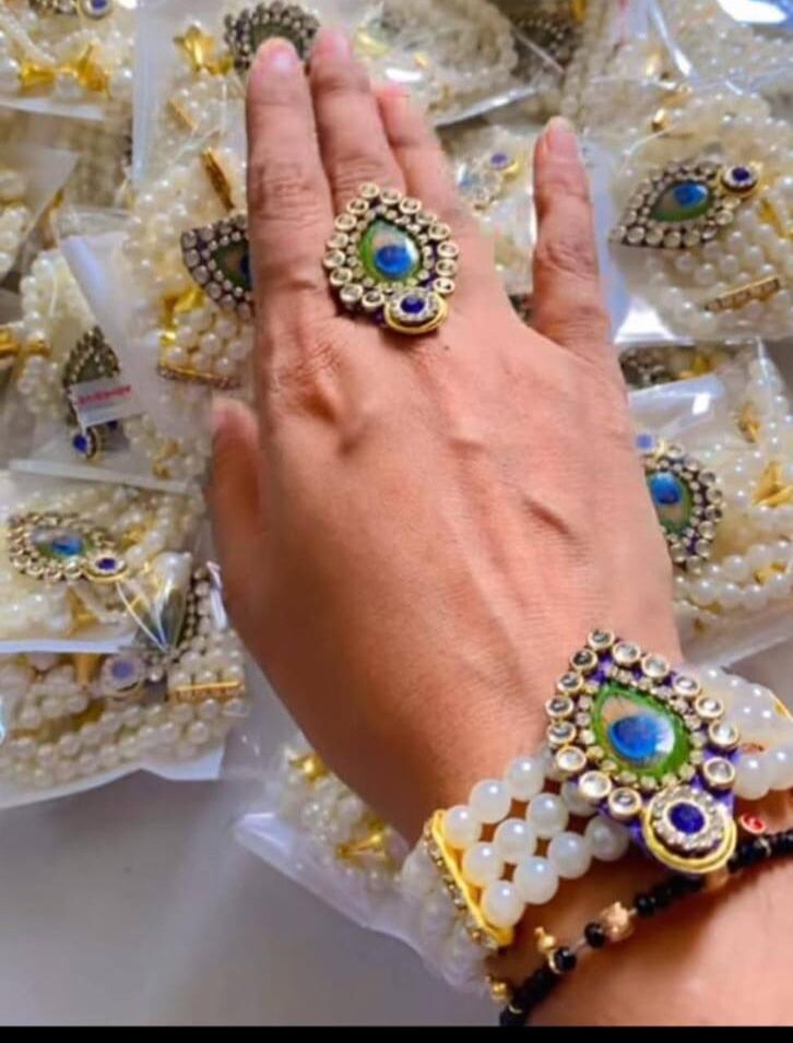 Add a touch of elegance to your traditional look with this stunning Morphank and Pearl Design Ring Bracelet . Crafted with fine detailing, this hand accessory features a graceful Mor Pankh (peacock feather) motif paired with pearl chains that beautifully connect the bracelet to the finger ring.